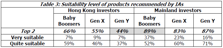 相比之下,只有59%的香港投資者認為產品是合適的,而第三代的差距更為嚴重。(表3)